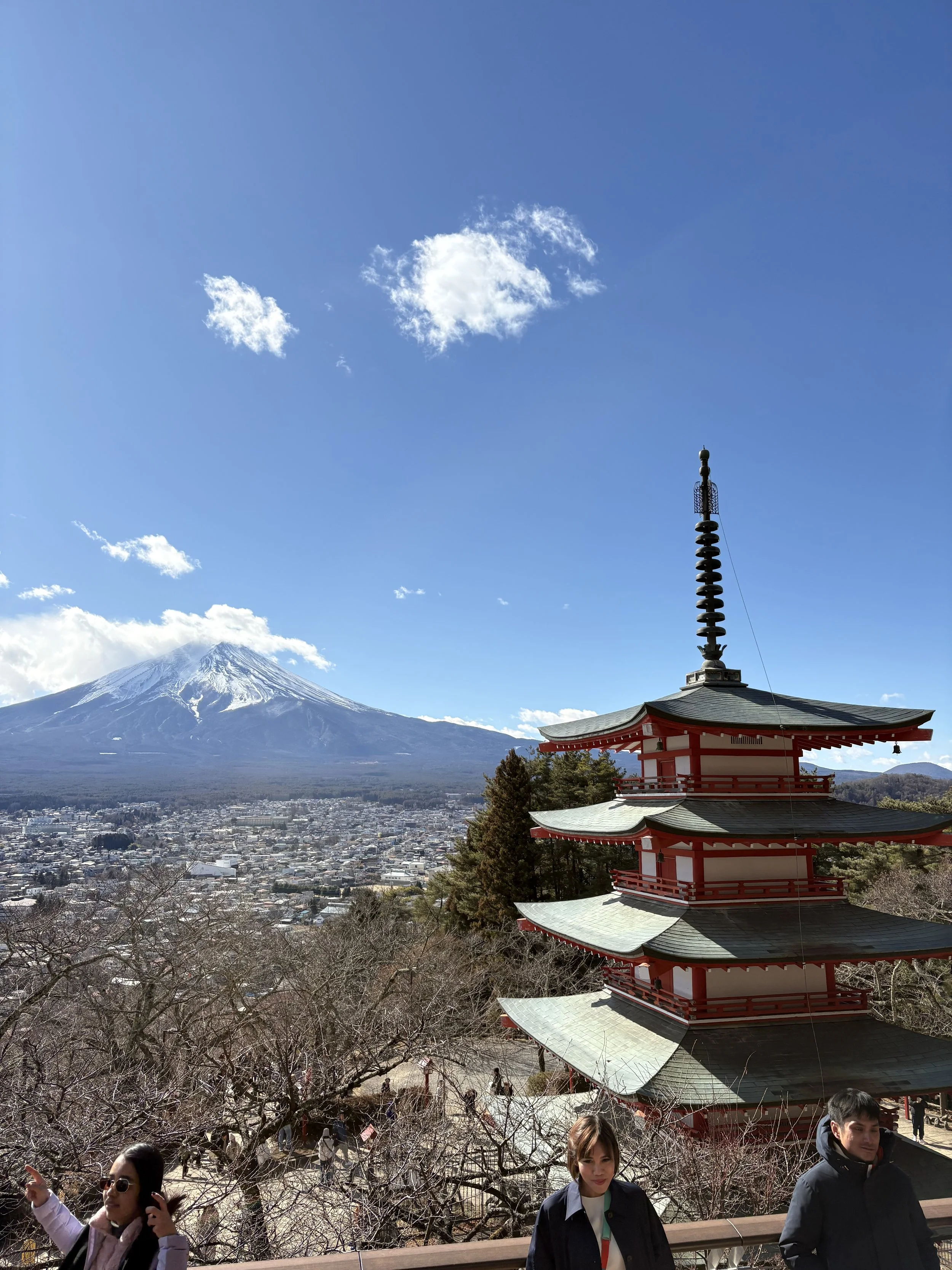 Start your morning at Arakurayama Sengen Park, home to the world-famous Chureito Pagoda. This is the quintessential "Japan" view: the bright red five-story pagoda framing a snow-capped Mt. Fuji.